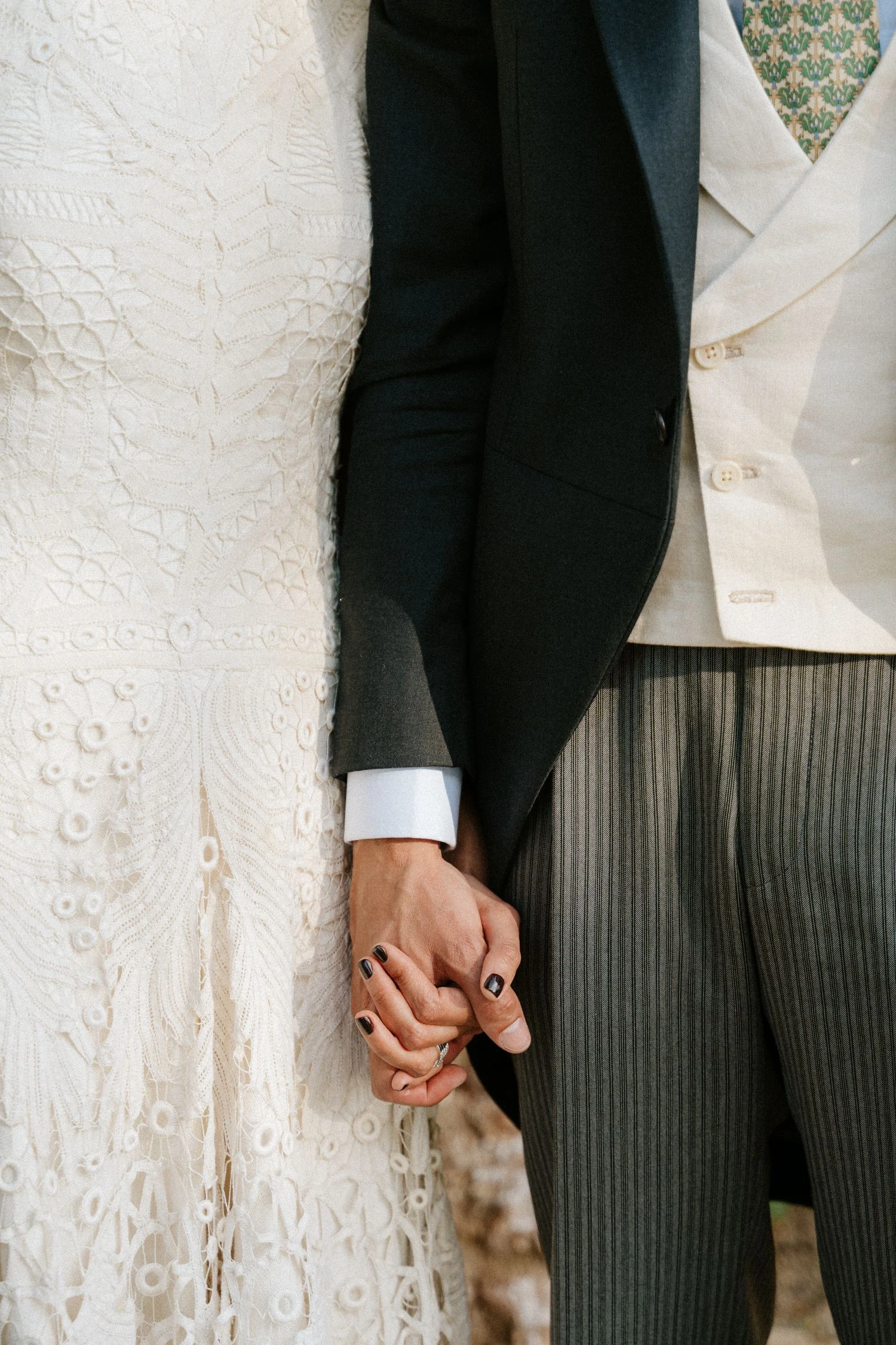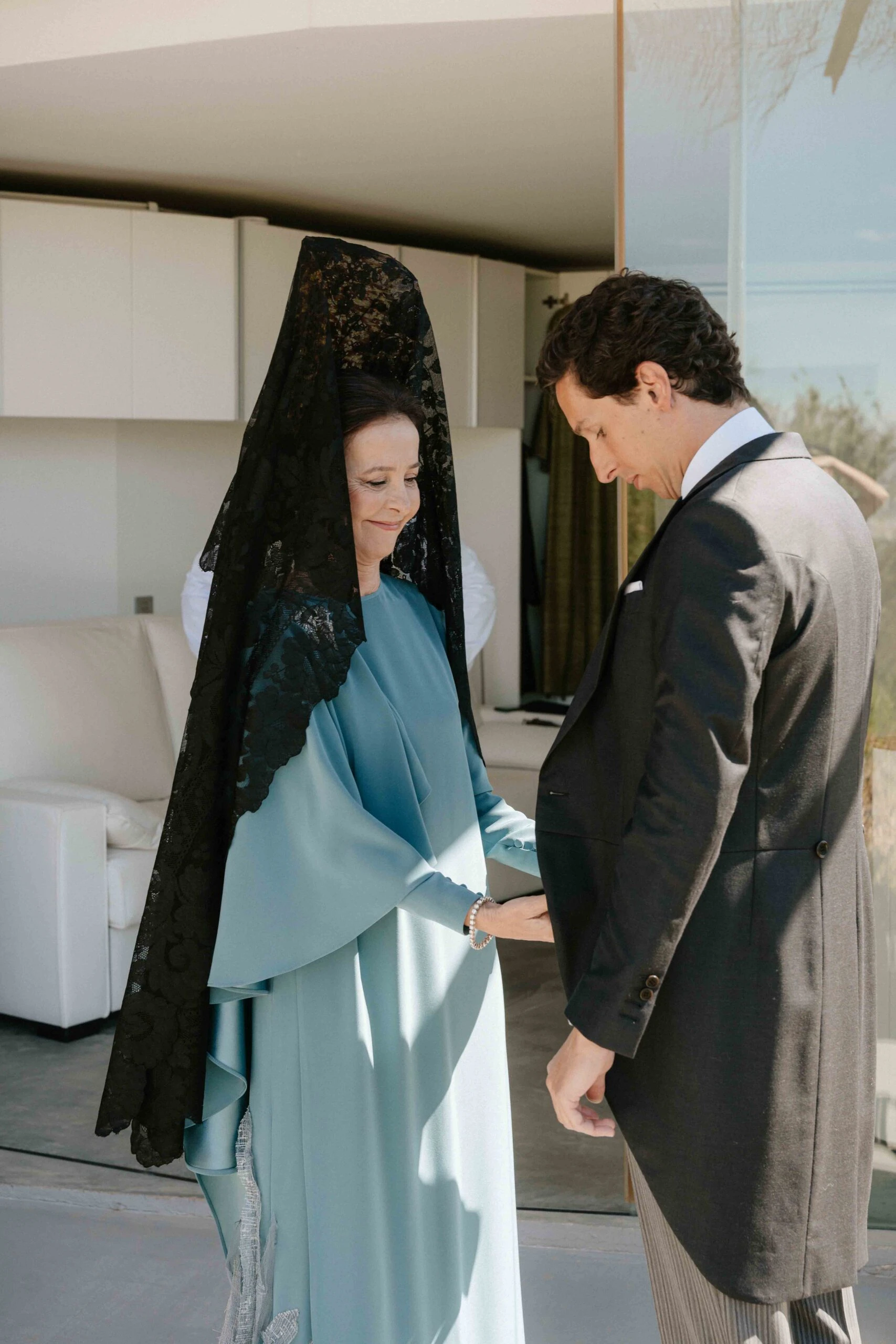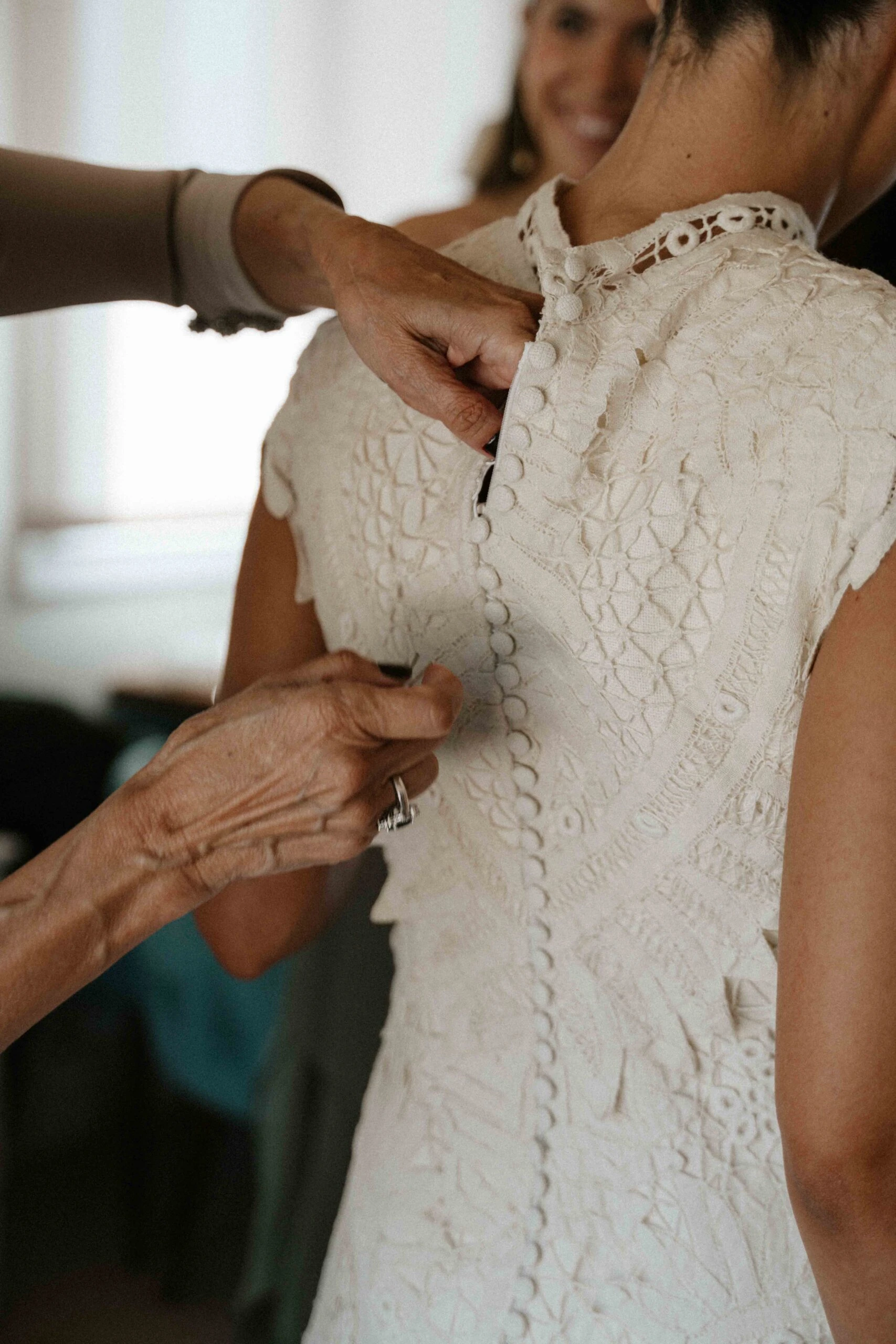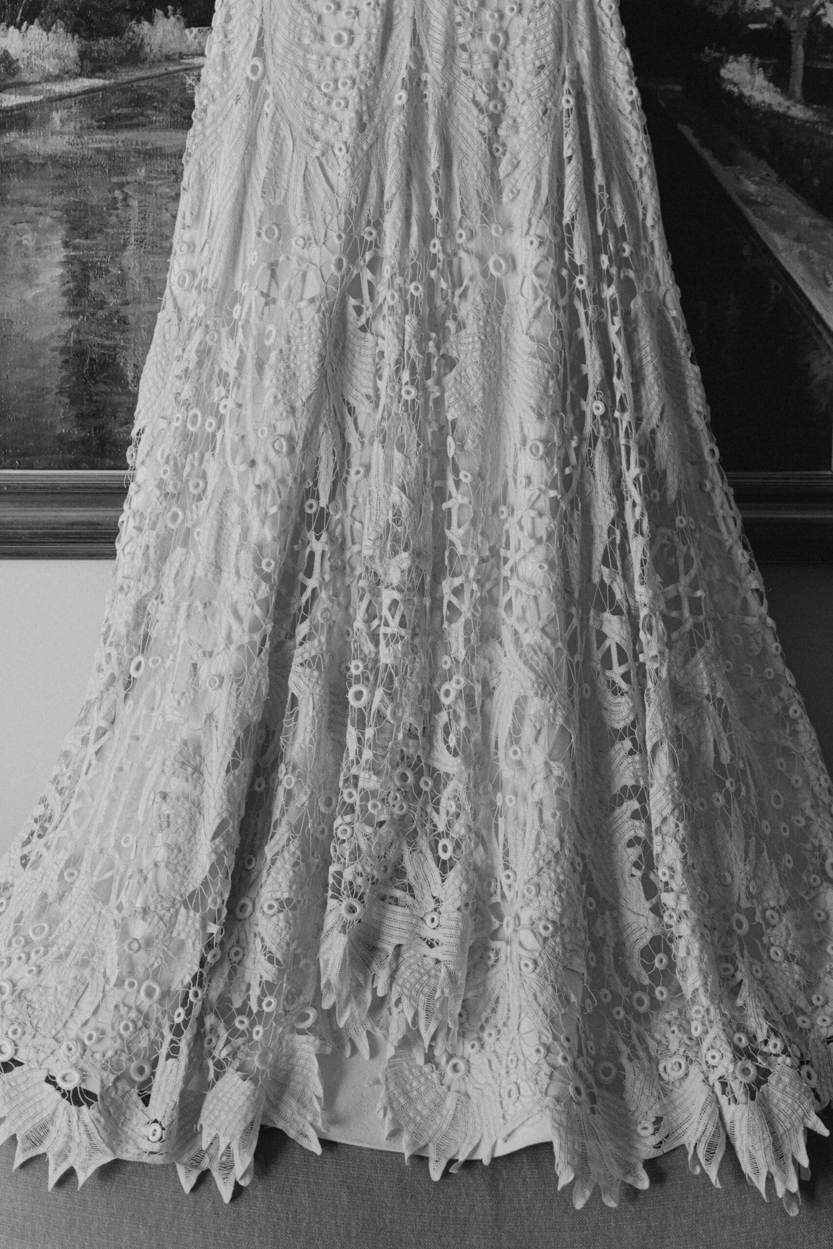 «Tenía claro que quería un vestido de encaje, así que una íntima amiga mía me recomendó acudir a Sofía Delgado. En cuanto vi esa pieza de cintas de finales del siglo XIX en el taller supe que era la mía y, a partir de ahí, construimos el diseño. La utilizamos para dar vuelo a la falda y la integramos con otra pieza similar que encontramos y tiñeron a mano, colocándola sobre el cuerpo hasta conseguir la silueta que buscábamos. También añadimos un interior de seda rústica que lo hacía más moderno y un velo de organza de seda con corte irregular».