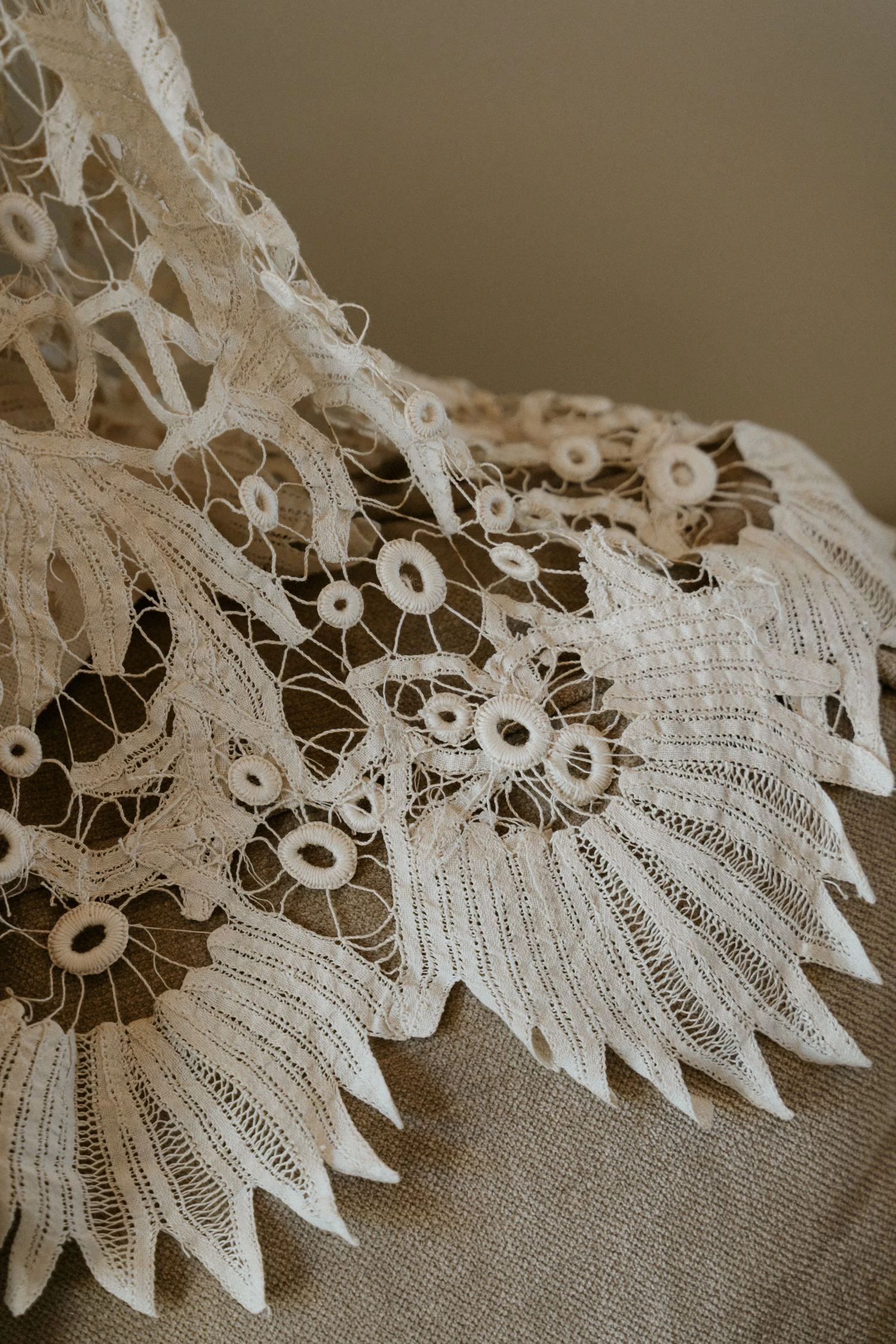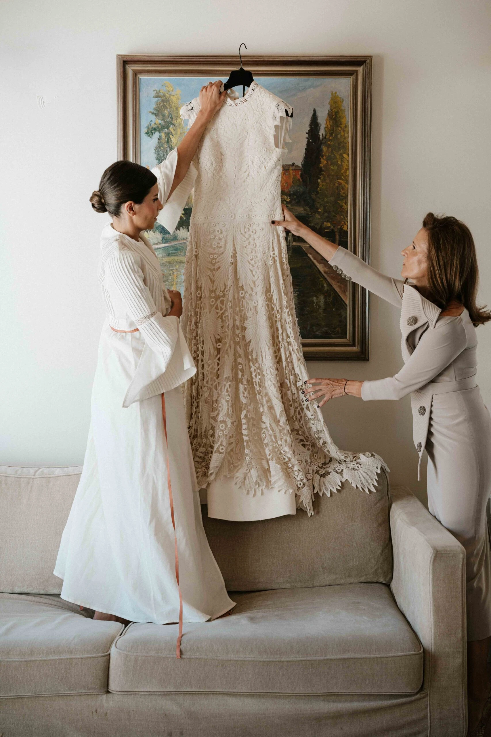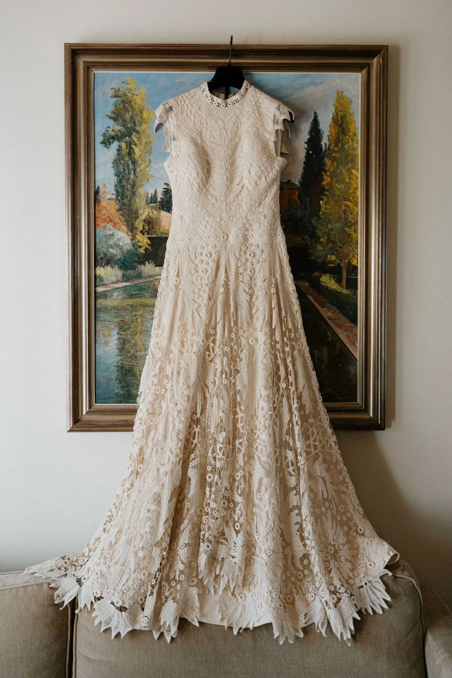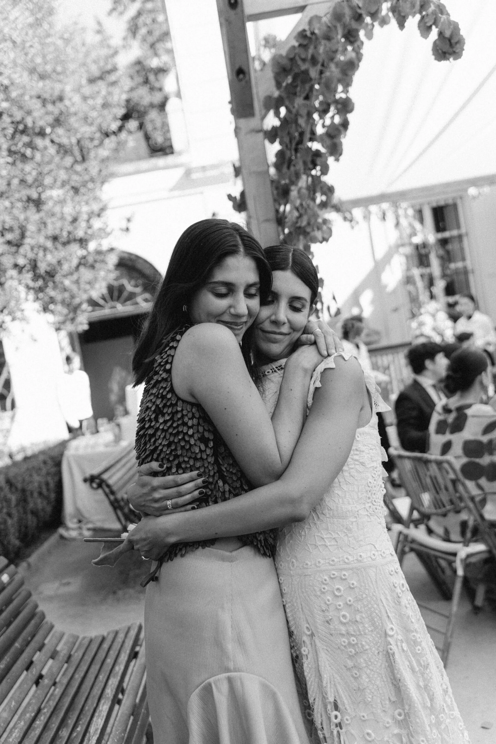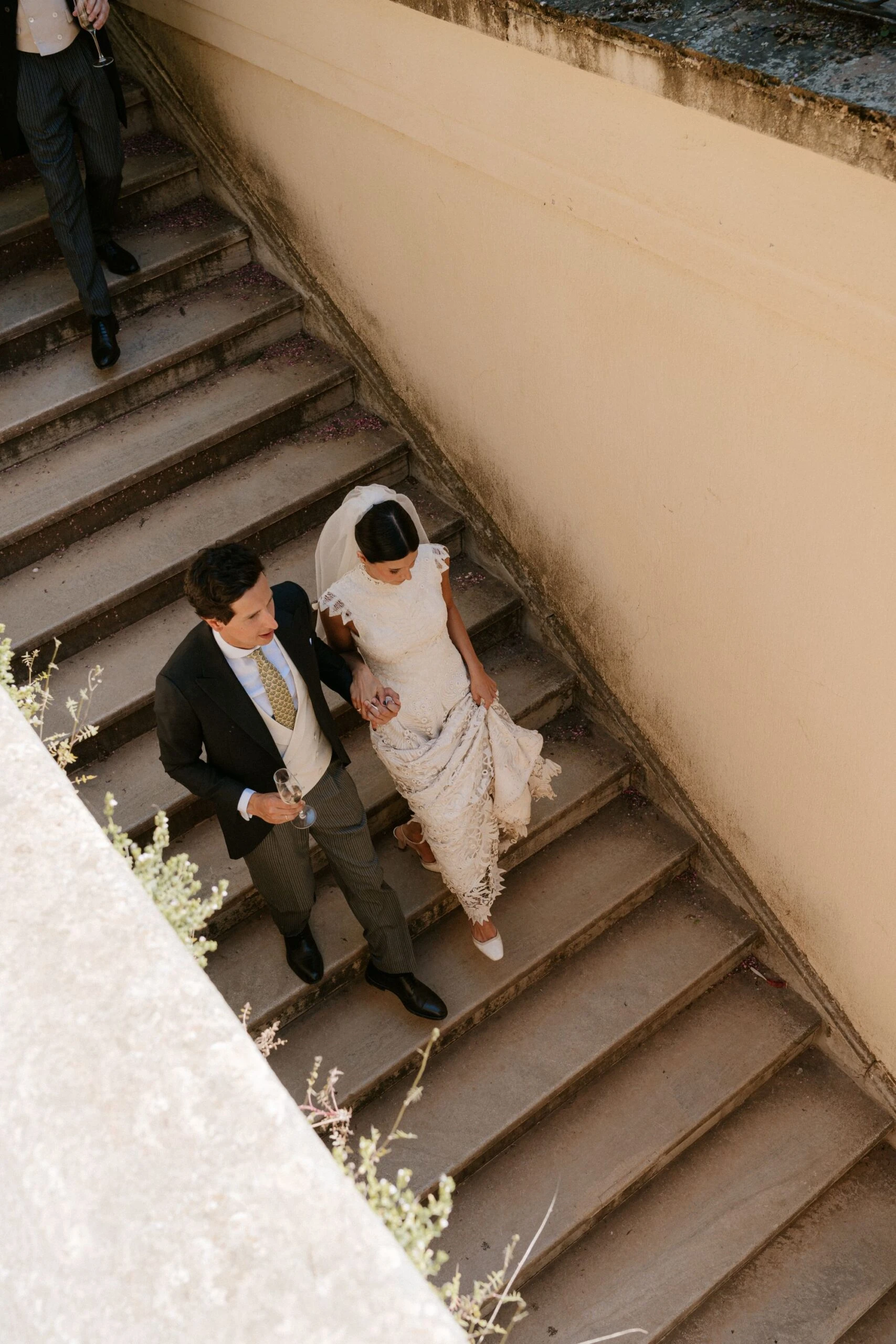 «Tenía claro que quería un vestido de encaje, así que una íntima amiga mía me recomendó acudir a Sofía Delgado. En cuanto vi esa pieza de cintas de finales del siglo XIX en el taller supe que era la mía y, a partir de ahí, construimos el diseño. La utilizamos para dar vuelo a la falda y la integramos con otra pieza similar que encontramos y tiñeron a mano, colocándola sobre el cuerpo hasta conseguir la silueta que buscábamos. También añadimos un interior de seda rústica que lo hacía más moderno y un velo de organza de seda con corte irregular».